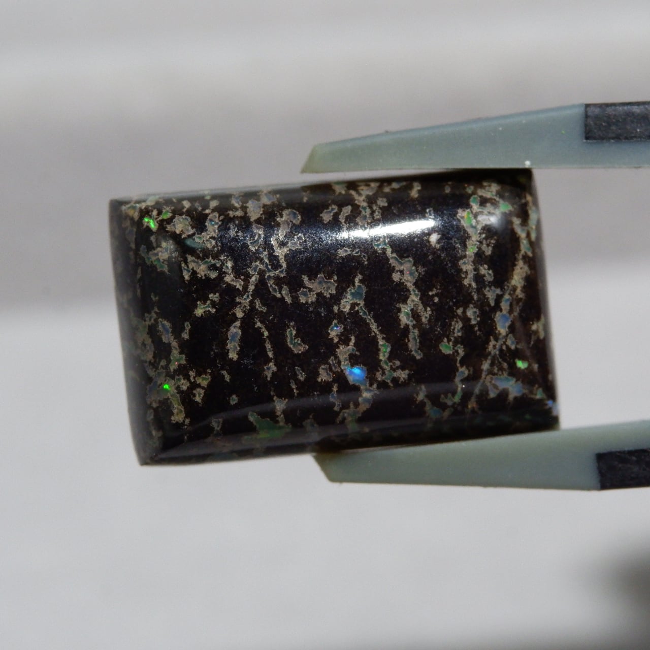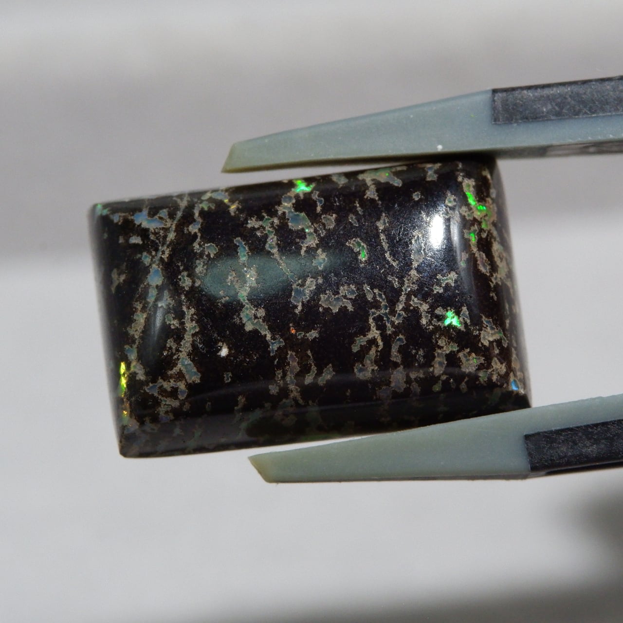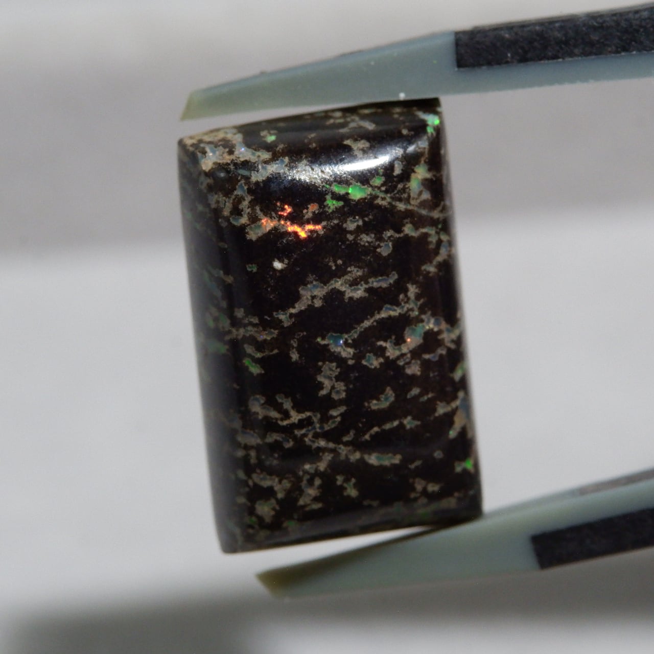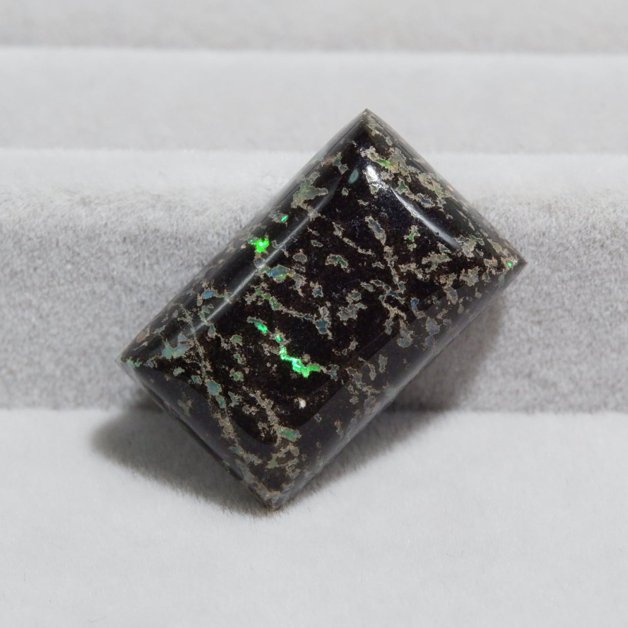 母岩である玄武岩の艶、オパールの遊色、どちらもお楽しみいただけます。