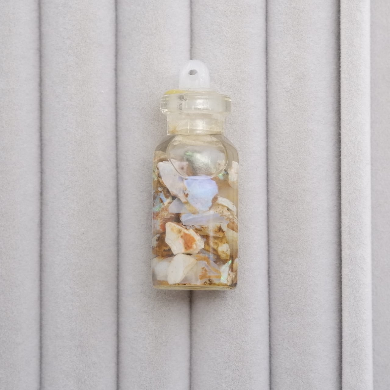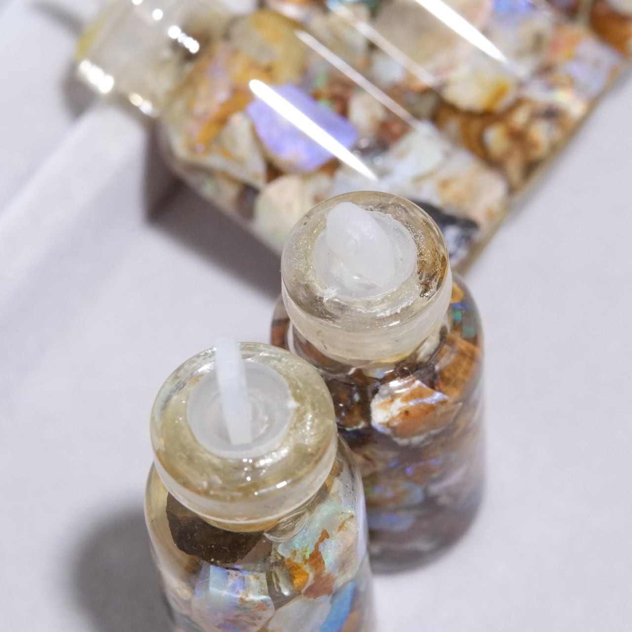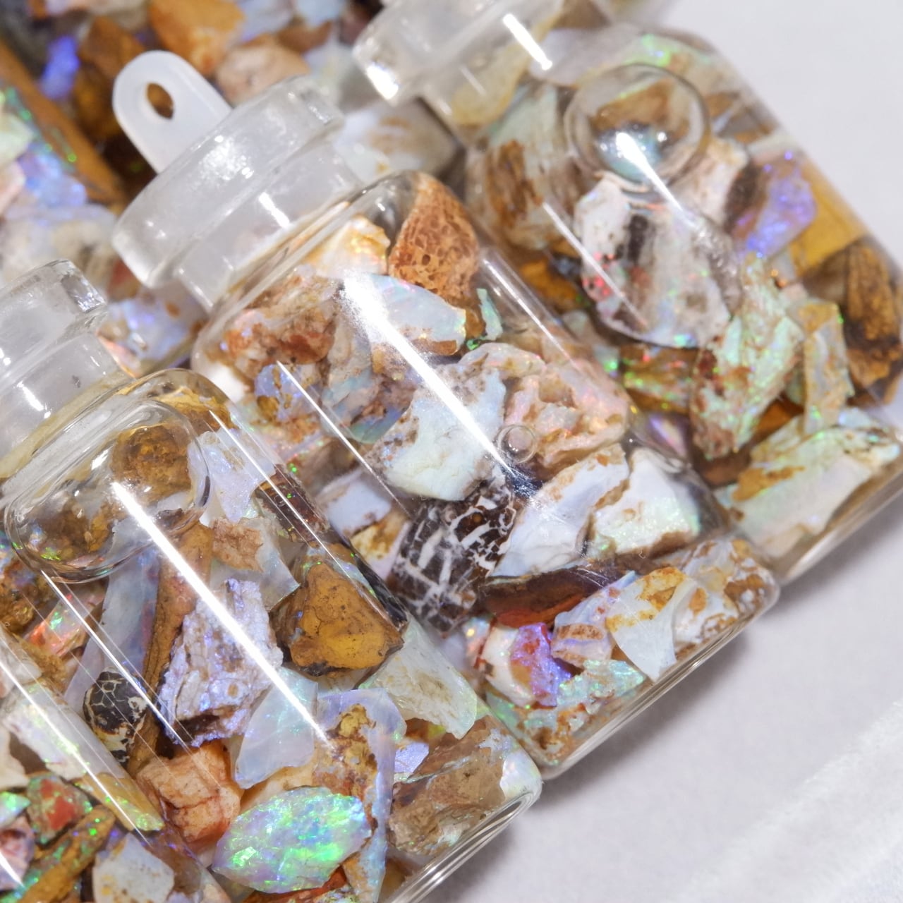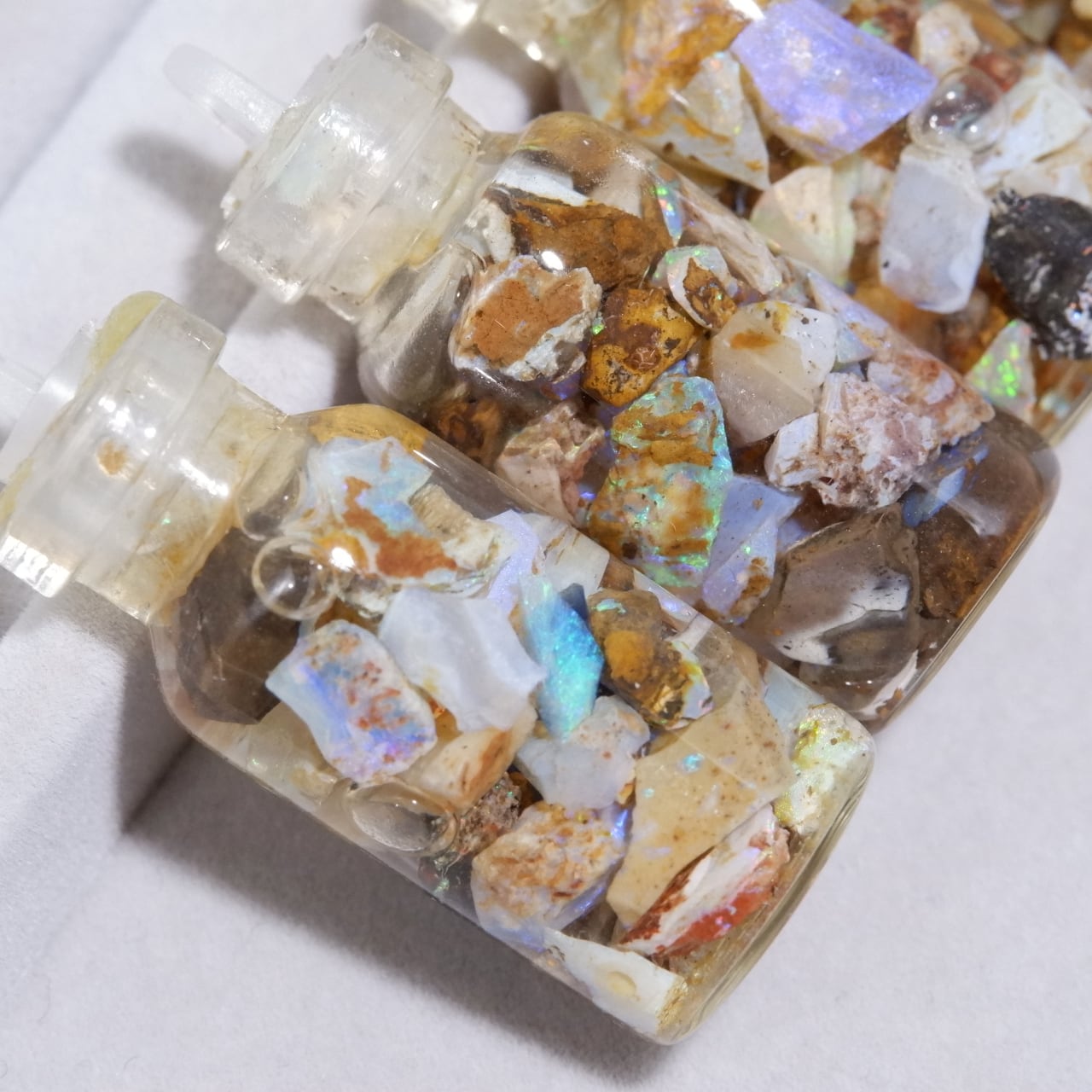小さなピクチャーオパールの原石が詰め込まれた水入り小瓶です。