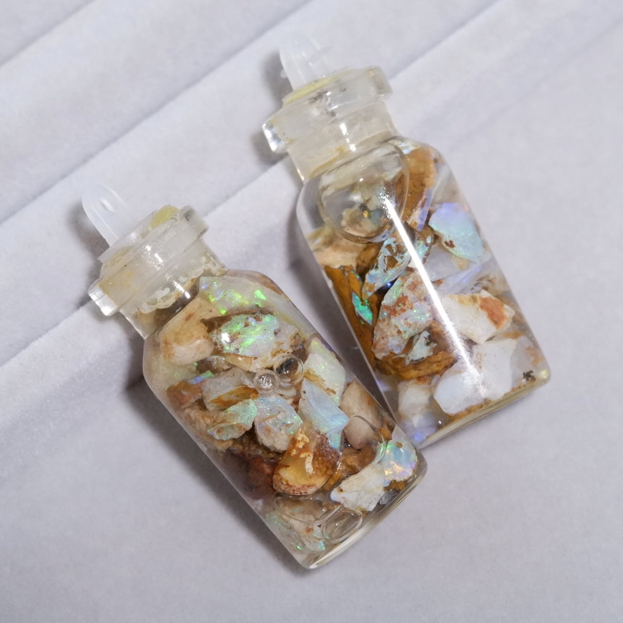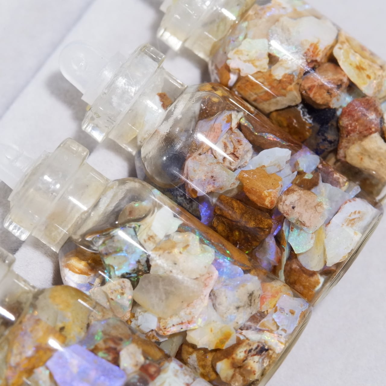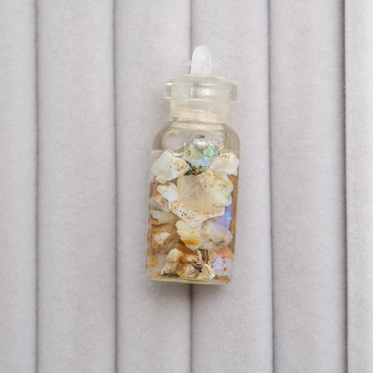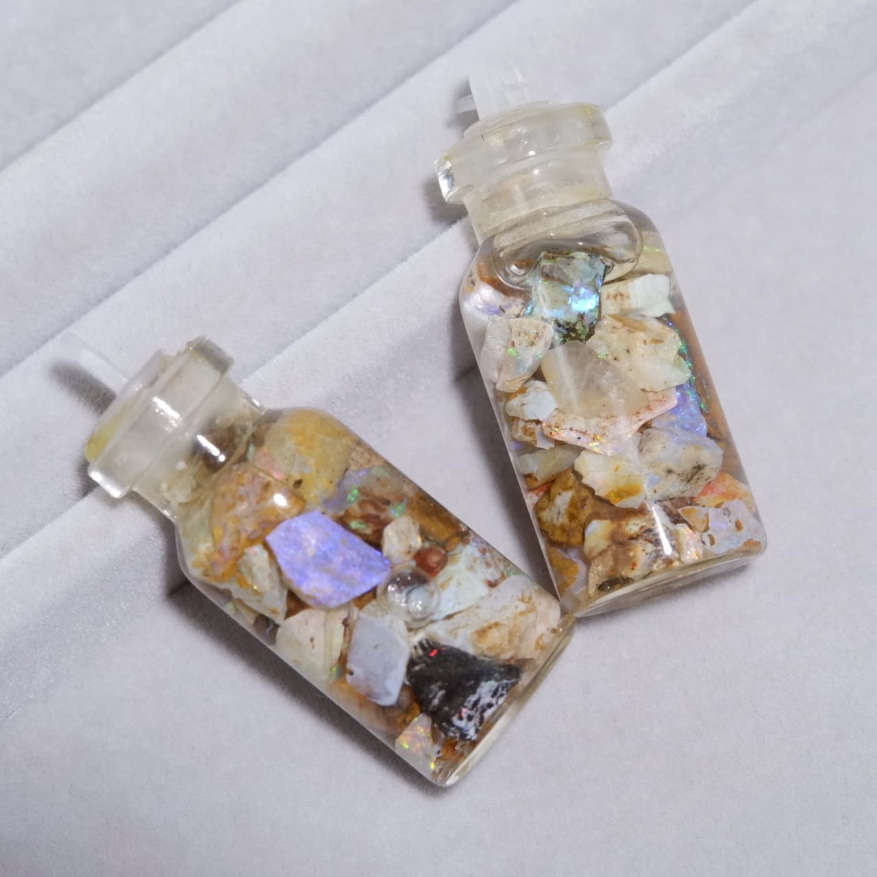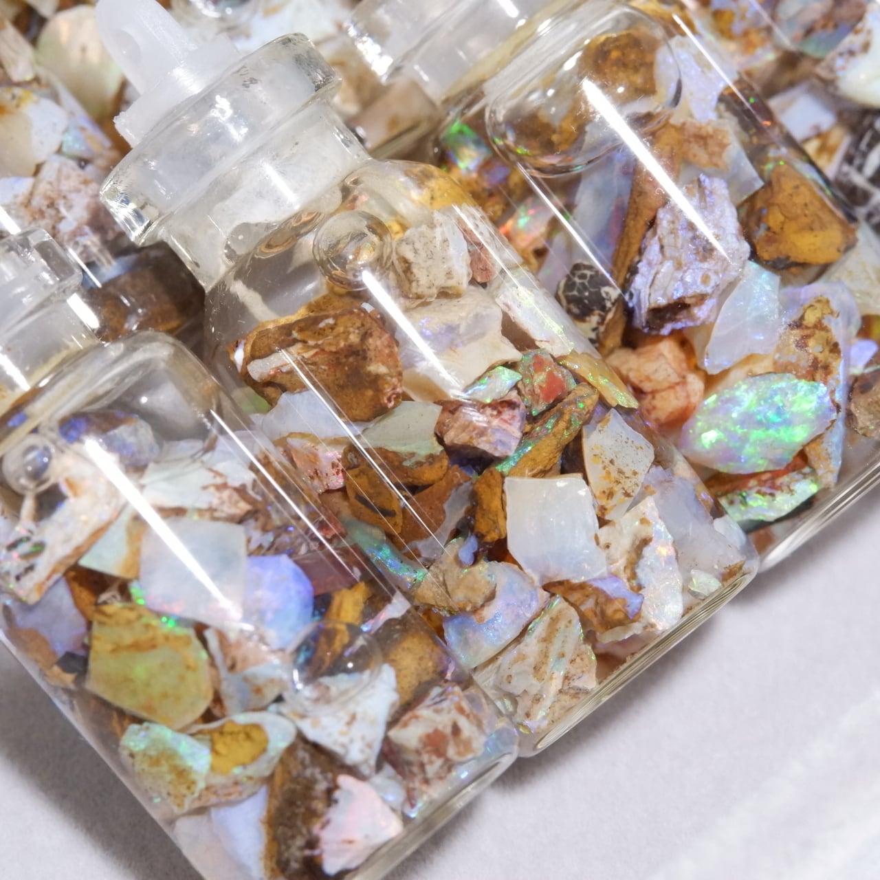 小さなピクチャーオパールの原石が詰め込まれた水入り小瓶です。