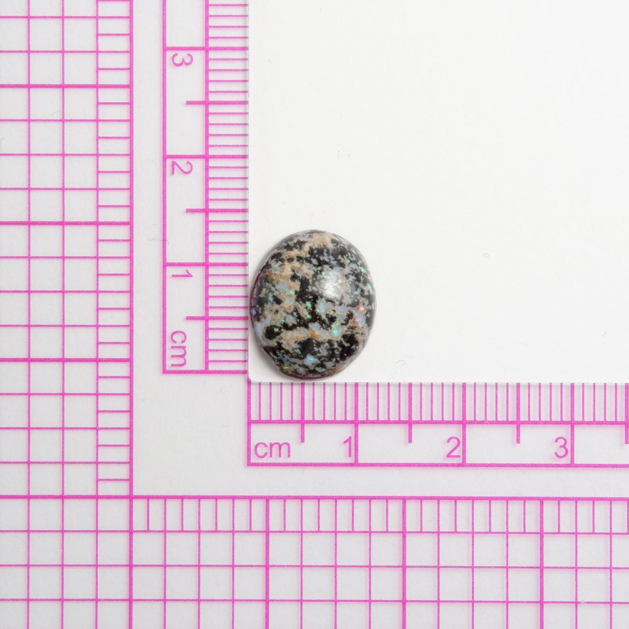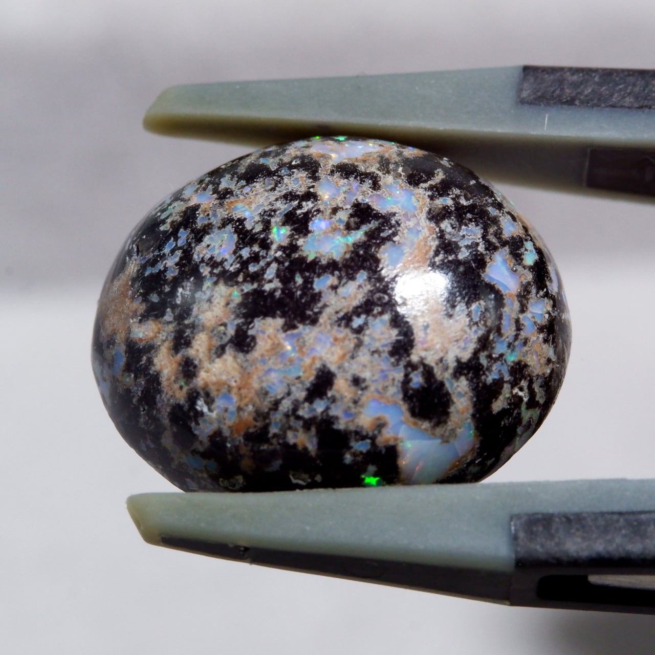 母岩の黒に鮮やかな遊色が映えるレオパードオパールです。